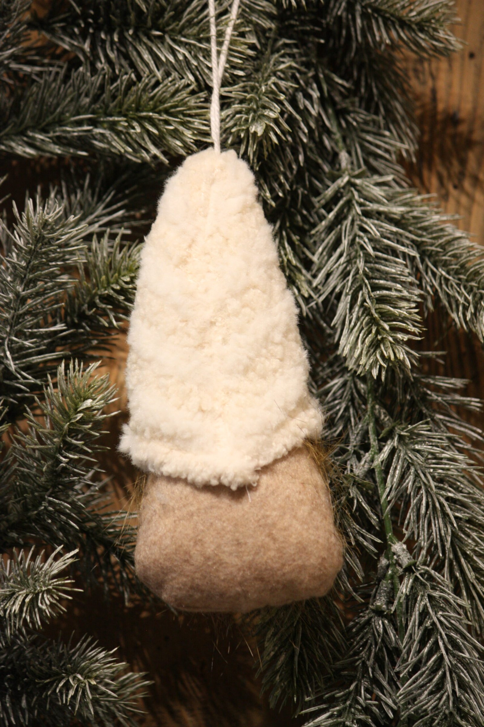 Ce petit gnome au bonnet écru, au corps beige et à la longue barbe vieillissante, se balade pour trouver une maison qui saura l’accueillir, il y apportera l'esprit de Noël avec beaucoup de bonheur et veillera secrètement sur la petite famille. A poser ou à suspendre.