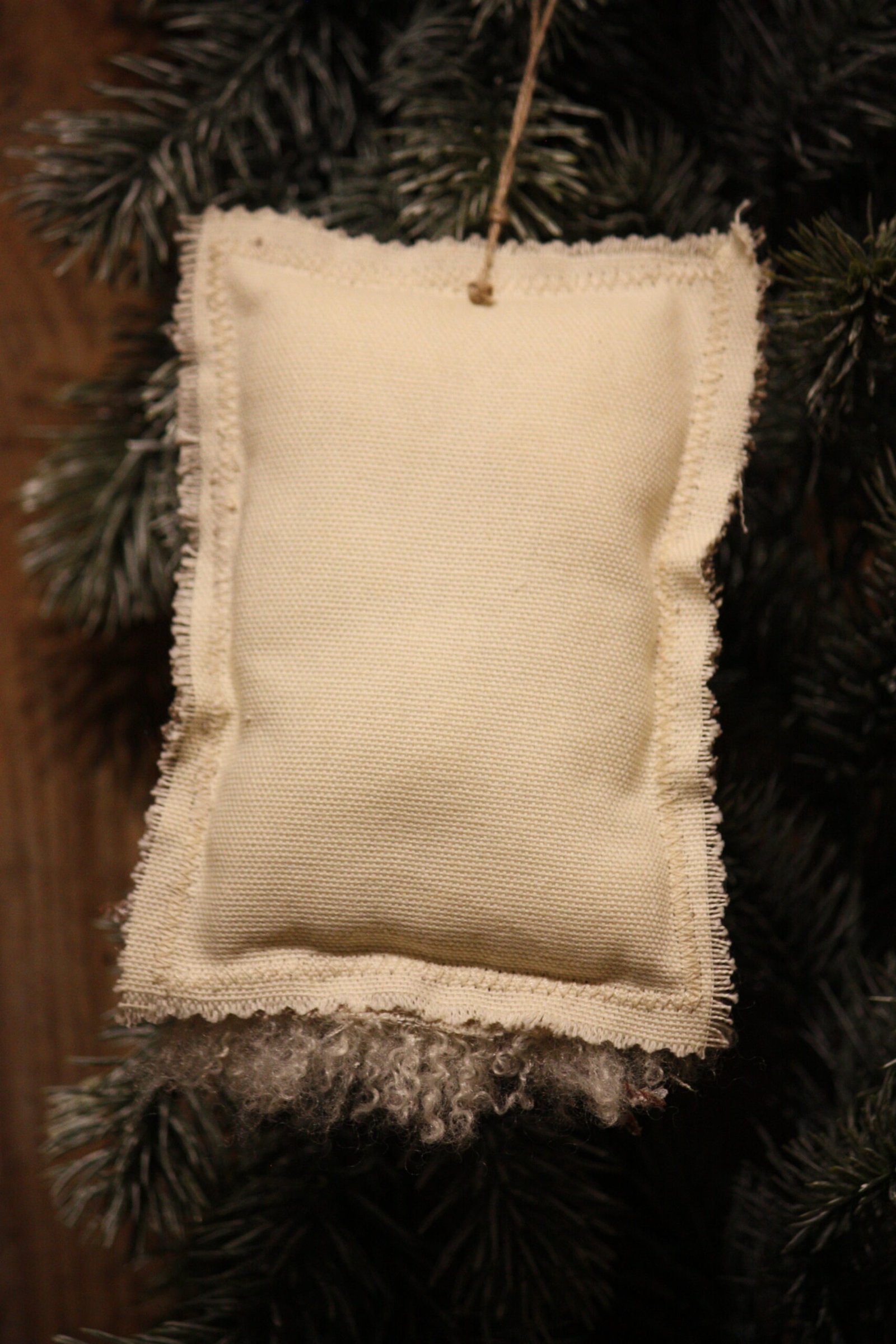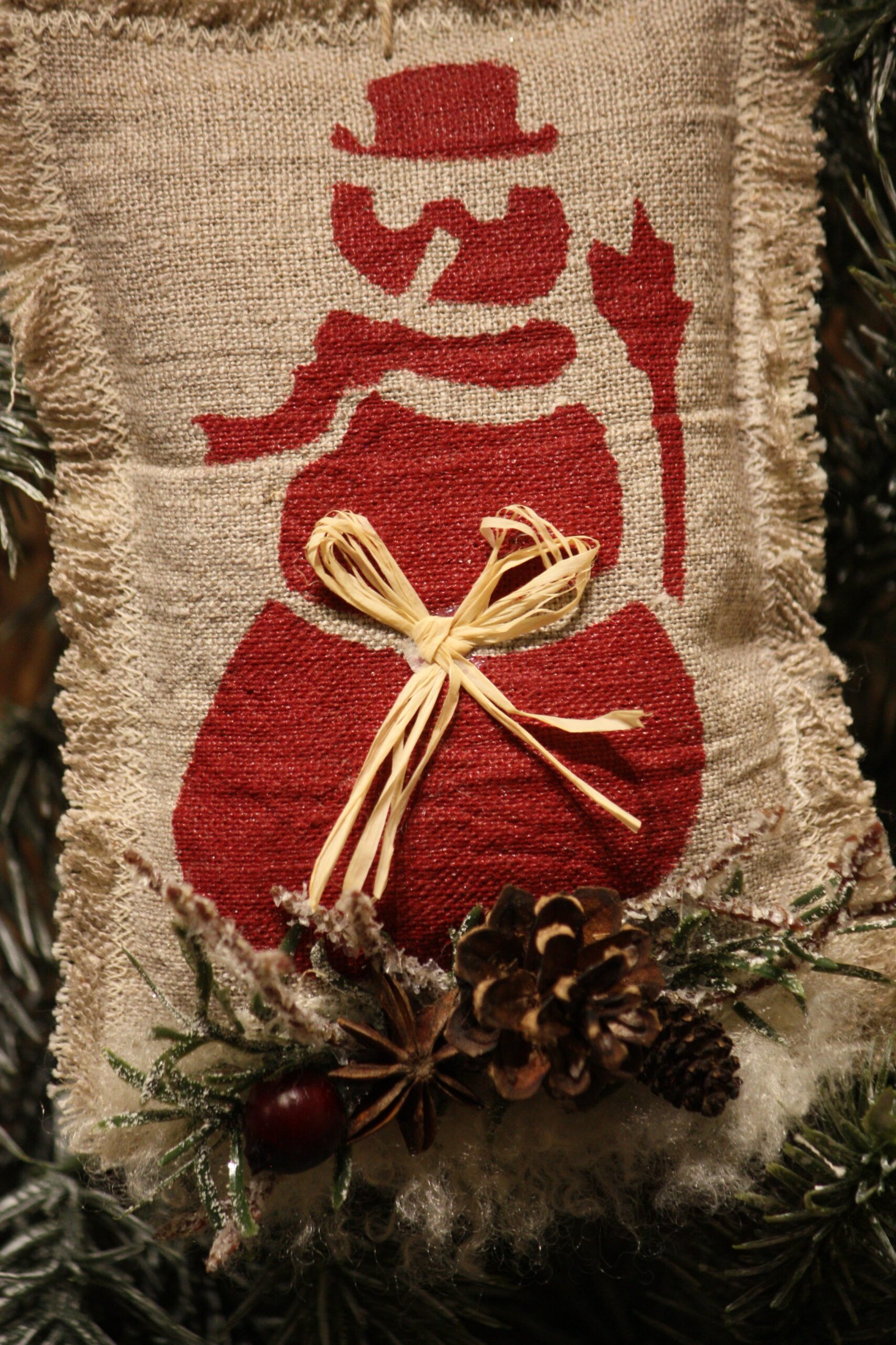 Petit coussin à suspendre au sapin ou ailleurs, motif un petit bonhomme de neige en rouge... Petit coussin en lin couleur taupe avec impression par nos soins d'un bonhomme de neige en rouge et lin écru à l'arrière / Véritable petite pomme de pin / Véritable badiane / Véritable petite pomme de pin de l'aulne / Sapin artificiel / Fausse fourrure / Petite ficelle pour suspendre / Rafia naturel / Création artisanale, par Boiseline