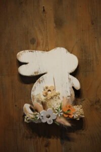 Sculpture en bois – Le lapin blanc de Pâques au milieu des fleurs