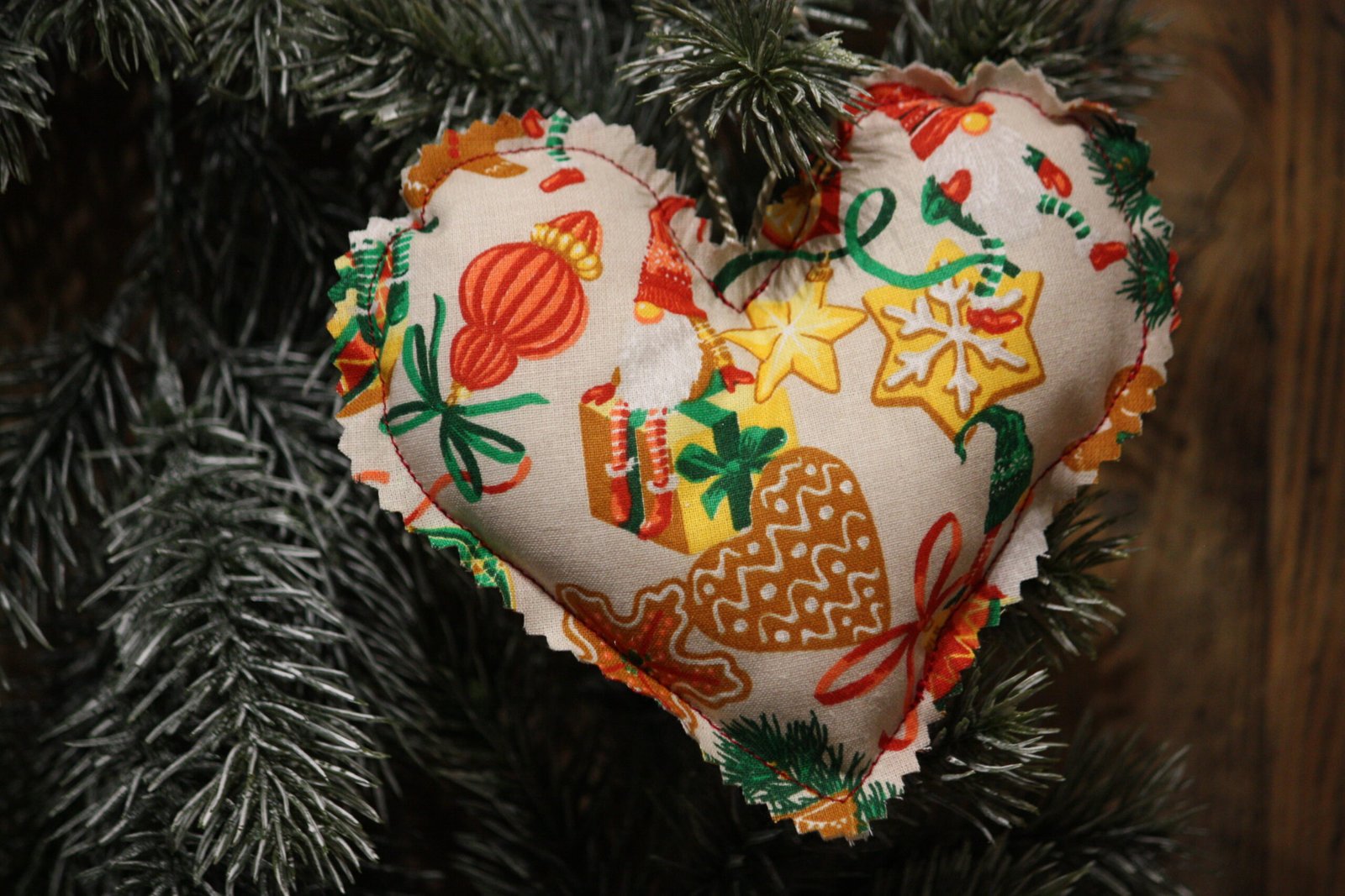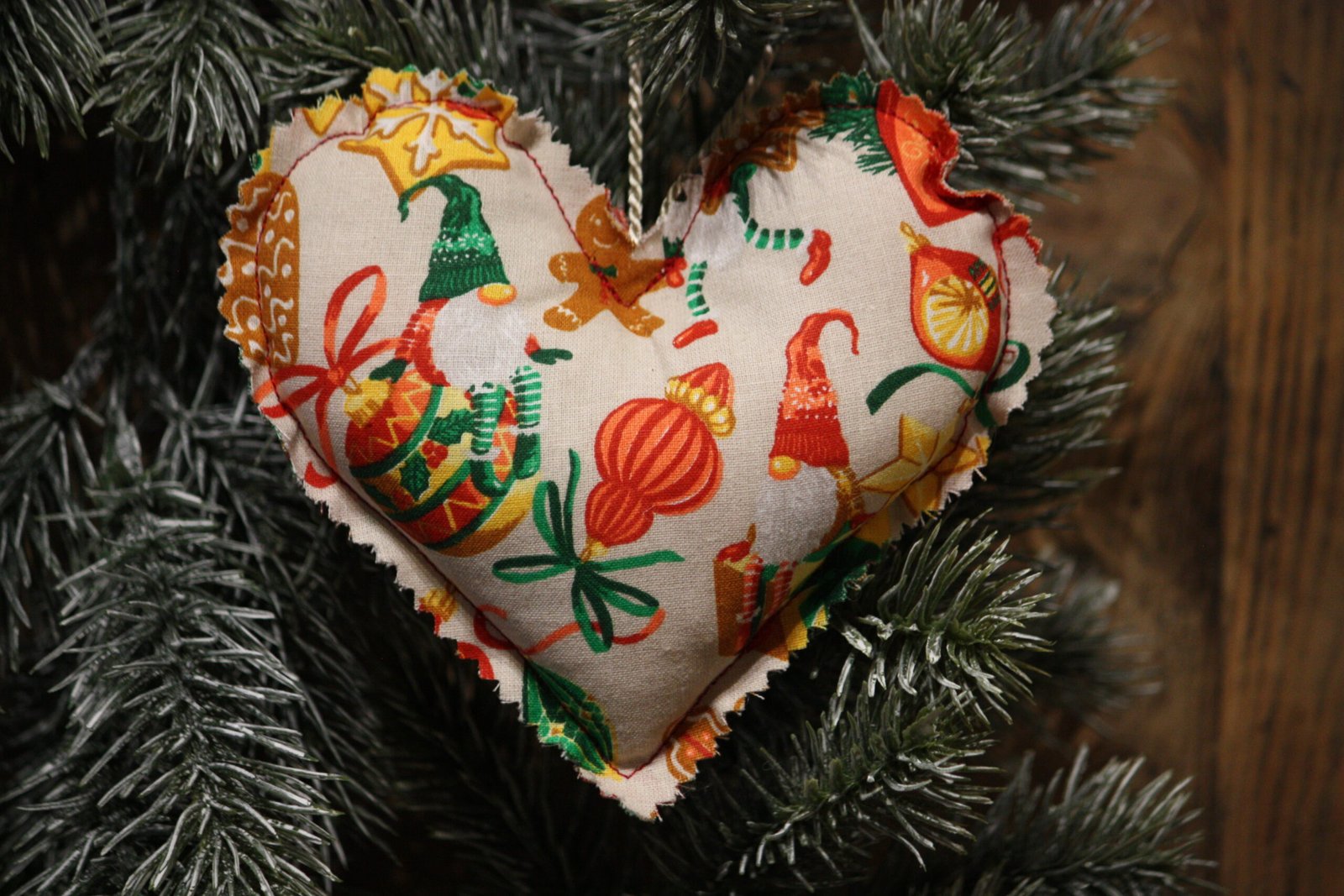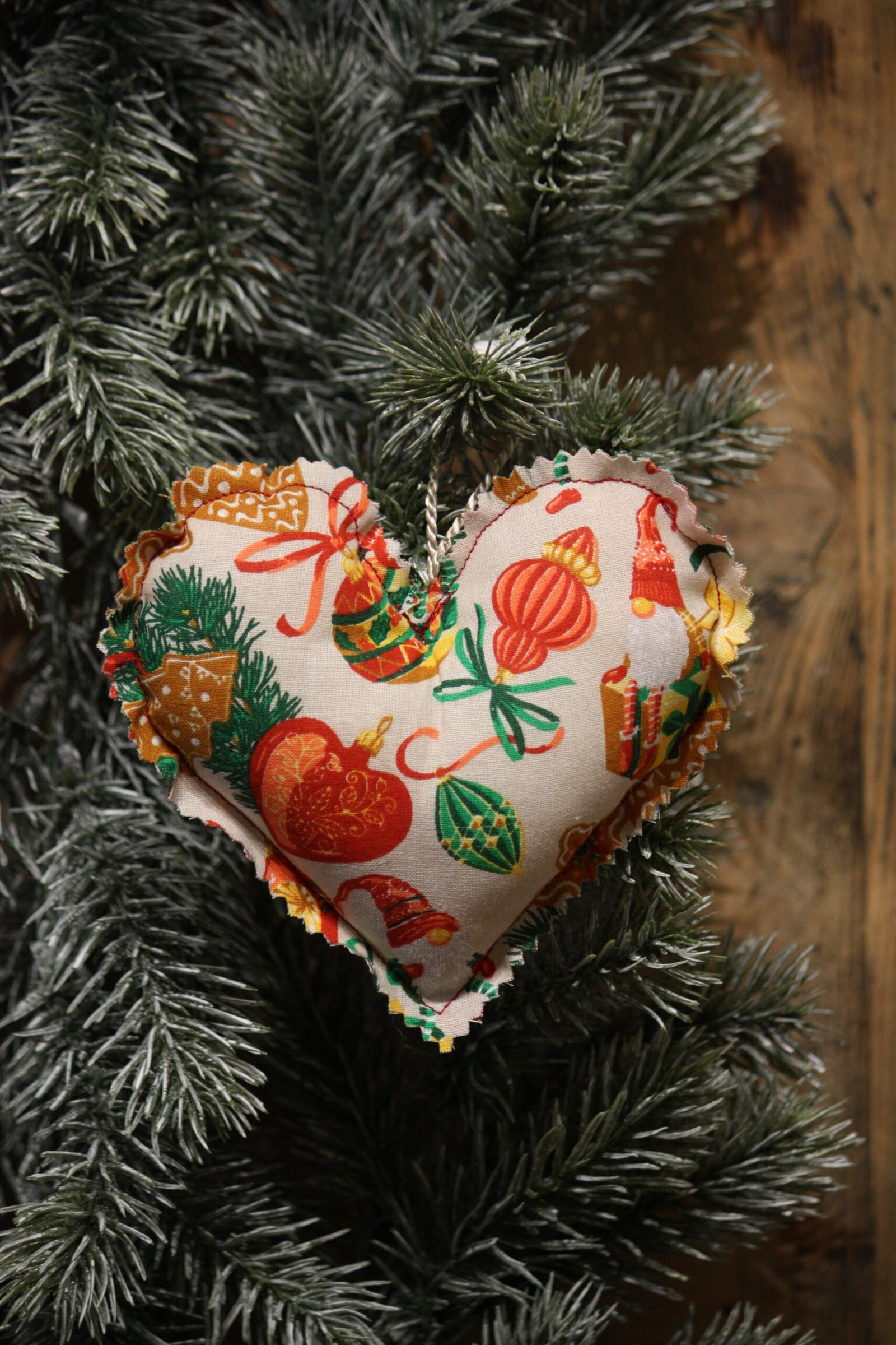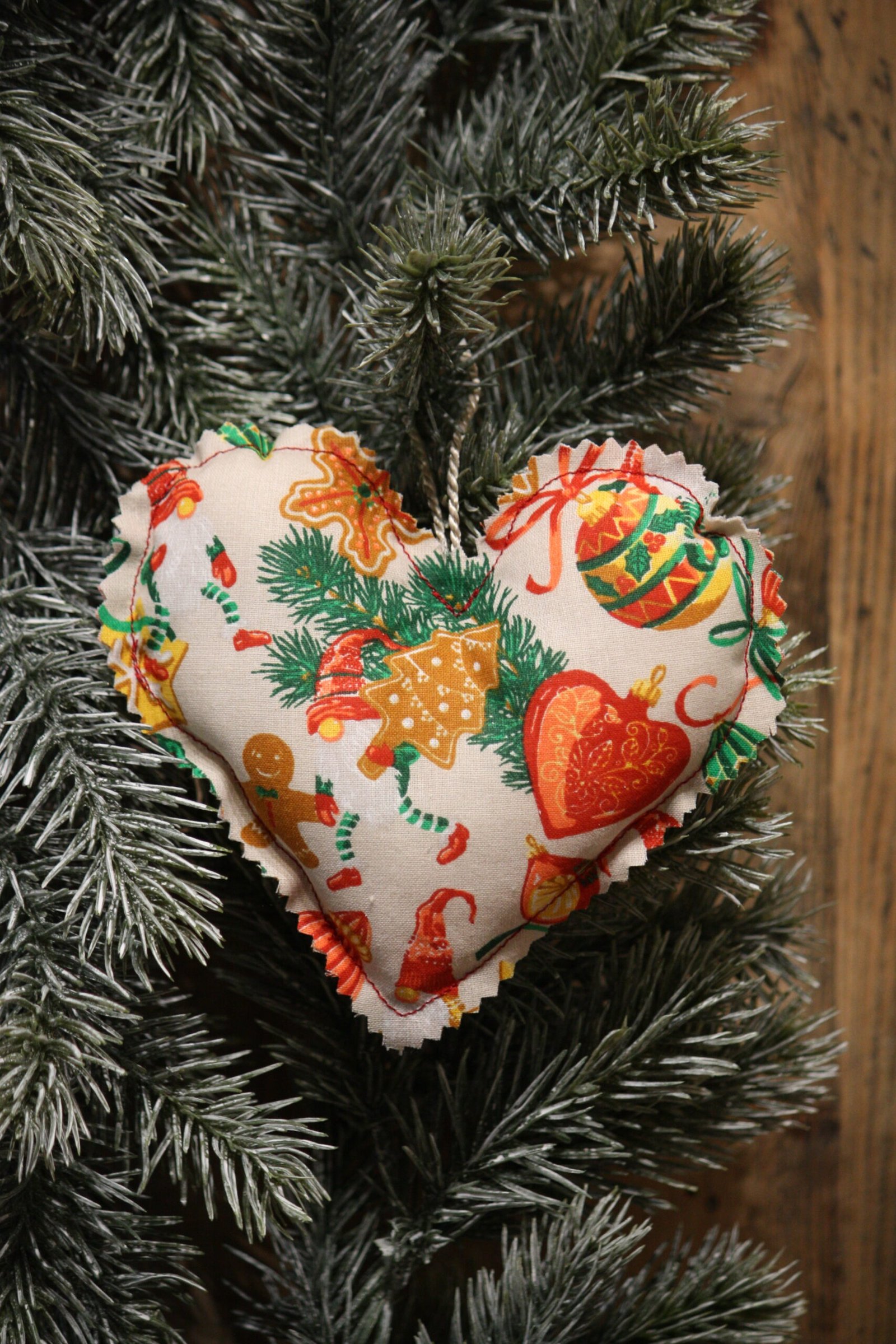 Coeur de Noël en tissu à suspendre au sapin ou ailleurs / Coeur en coton imprimé motif noël / Petite cordelette pour suspendre / Création artisanale, par Boiseline