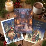 Cette carte de vœux 2026 présente une charmante illustration d’un village aux rues pavées, enneigées. Les maisons s’illuminent sous la douce …
