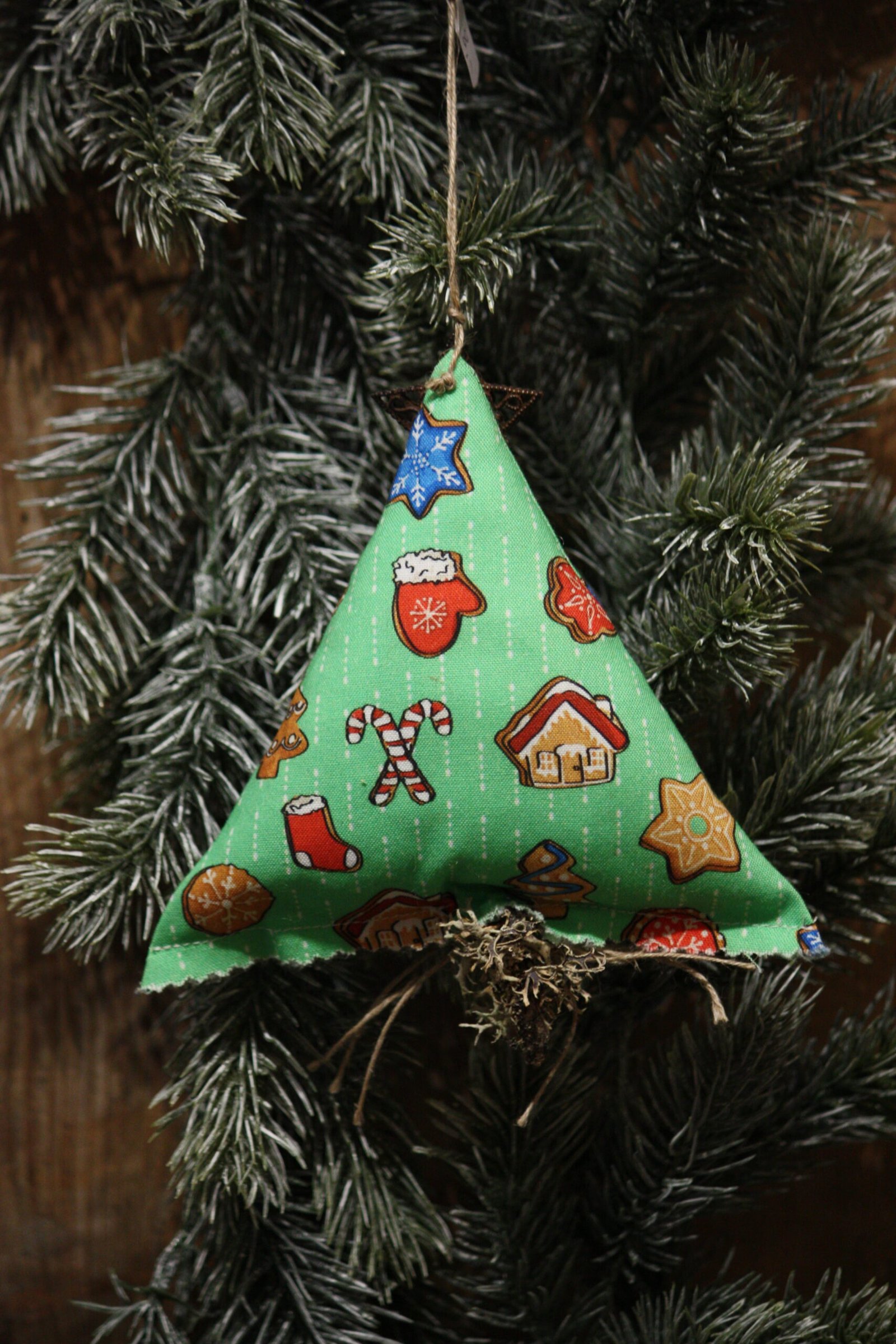 Petit sapin de Noël en tissu à suspendre au sapin ou ailleurs / Petit sapin en coton imprimé motif noël / Galon / Petite ficelle pour suspendre / Petit bâtonnet en bois pour le pied du sapin / Petite ficelle / Petite étoile en métal / Véritable lichen / Création artisanale, par Boiseline