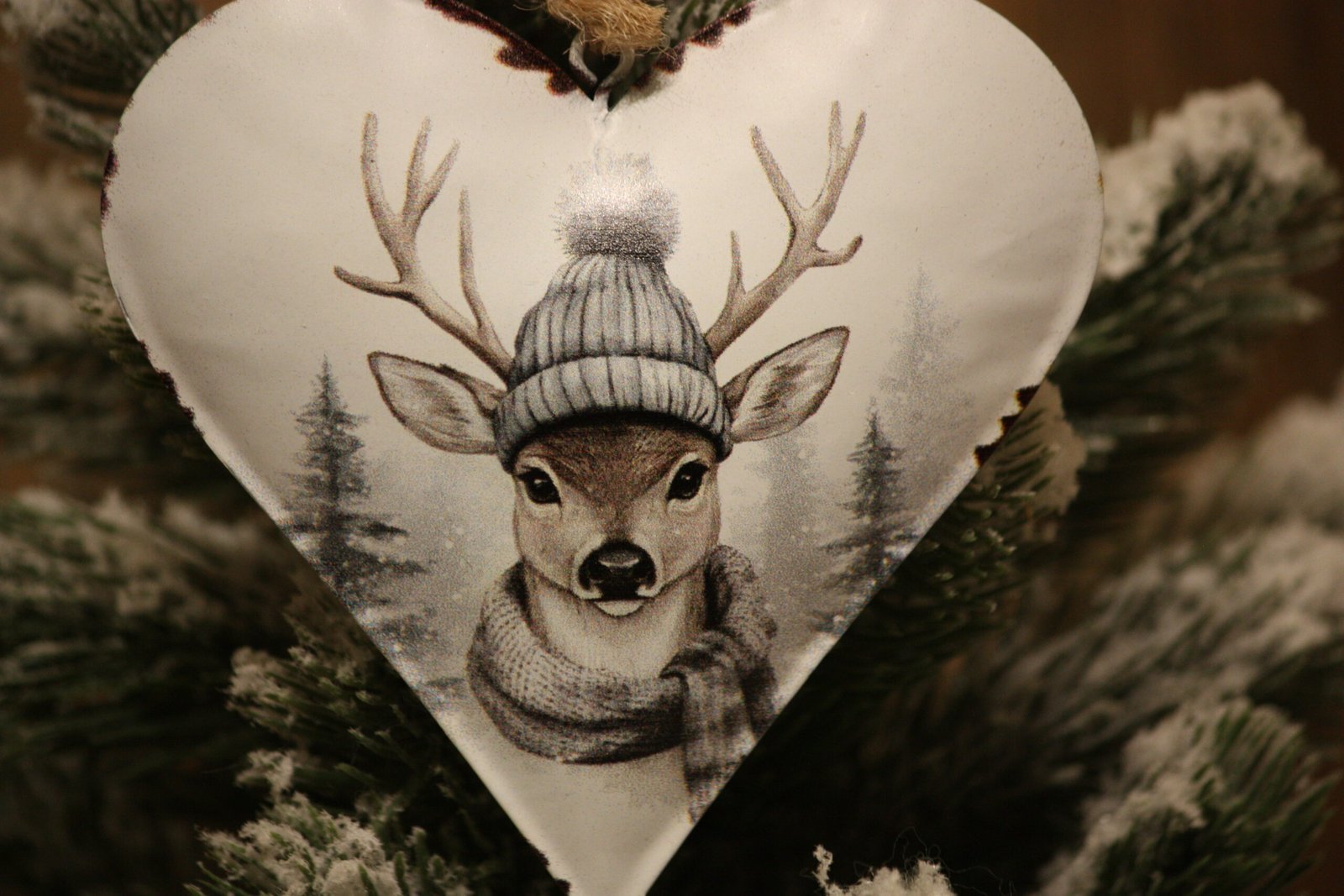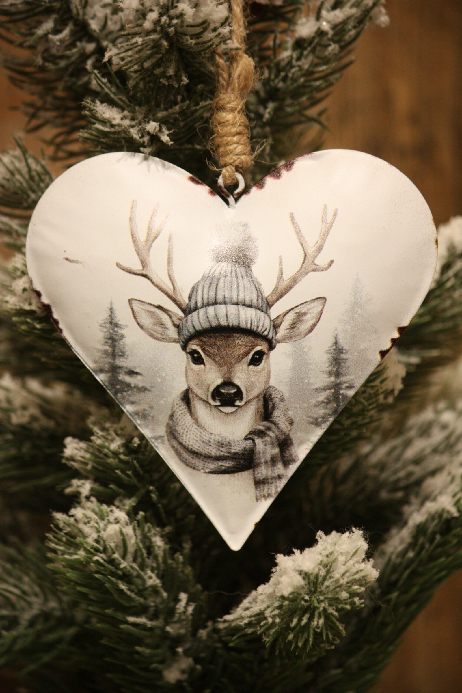 Apportez un peu de douceur à vos décorations de Noël ou d'hiver avec ce coeur en métal avec un cerf comme motif. Coeur en métal avec comme motif  un cerf en impression / Crochet en métal / Petite corde naturelle pour suspendre