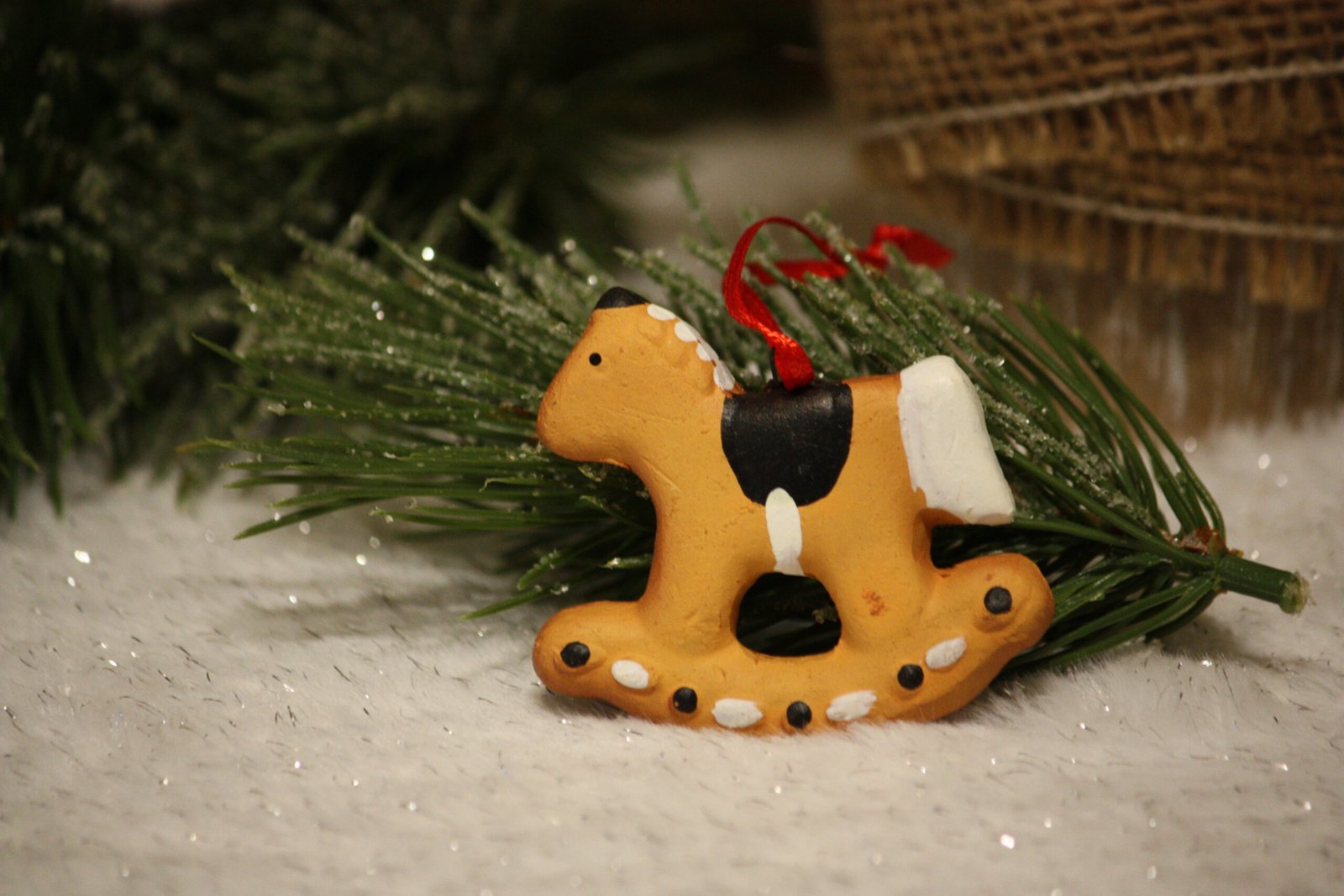 Apportez un peu de douceur à votre décoration avec ce petit cheval à bascule de noël en argile façon petit pain d'épices, à suspendre / Petit cheval à bascule en argile maintenu par un crochet en métal / Petit ruban satin rouge pour suspendre.