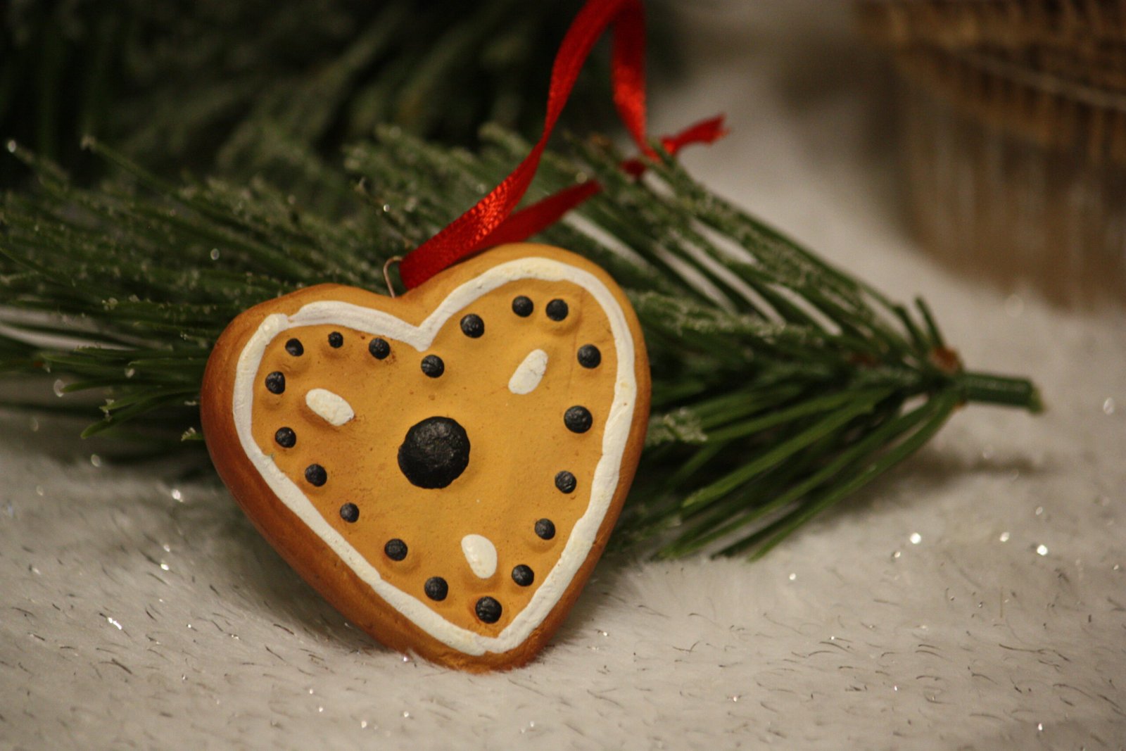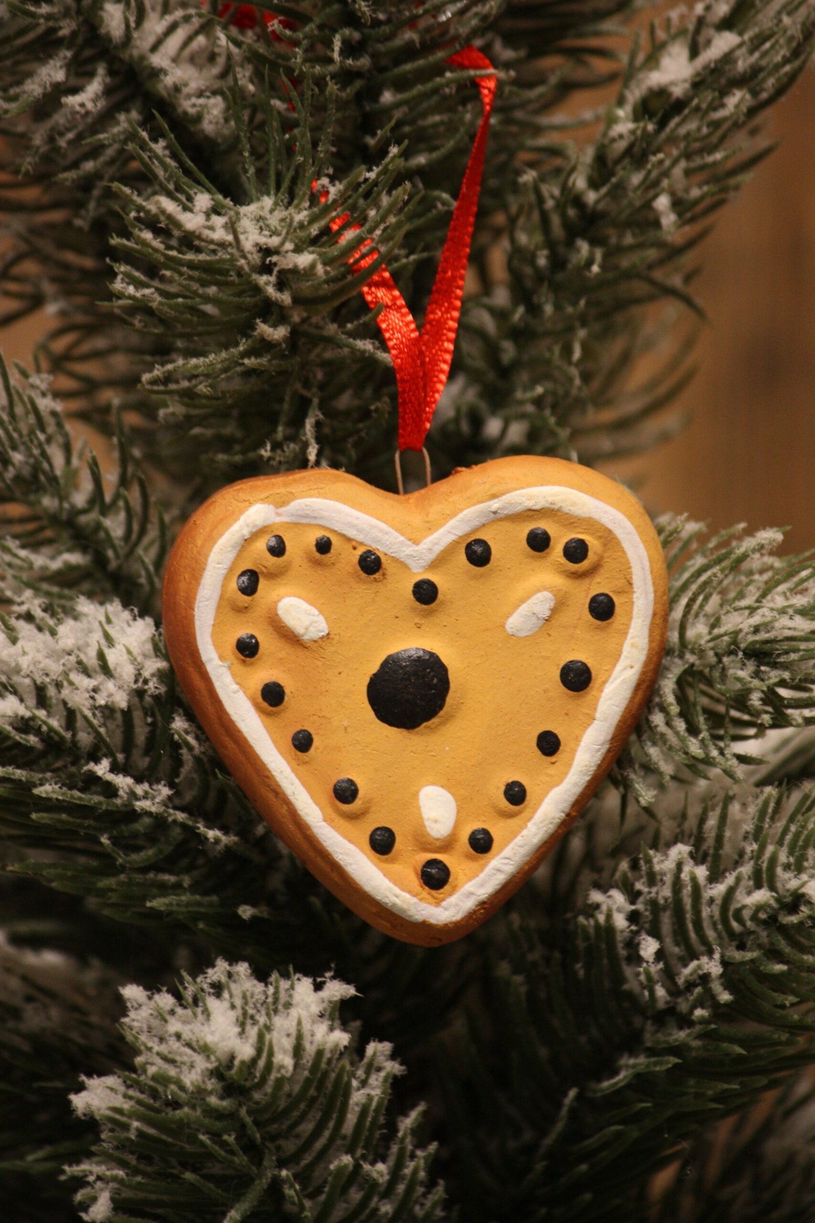 Apportez un peu de douceur à votre décoration avec ce petit coeur de noël en argile façon petit pain d'épices, à suspendre / Petit coeur en argile maintenu par un crochet en métal / Petit ruban satin rouge pour suspendre.