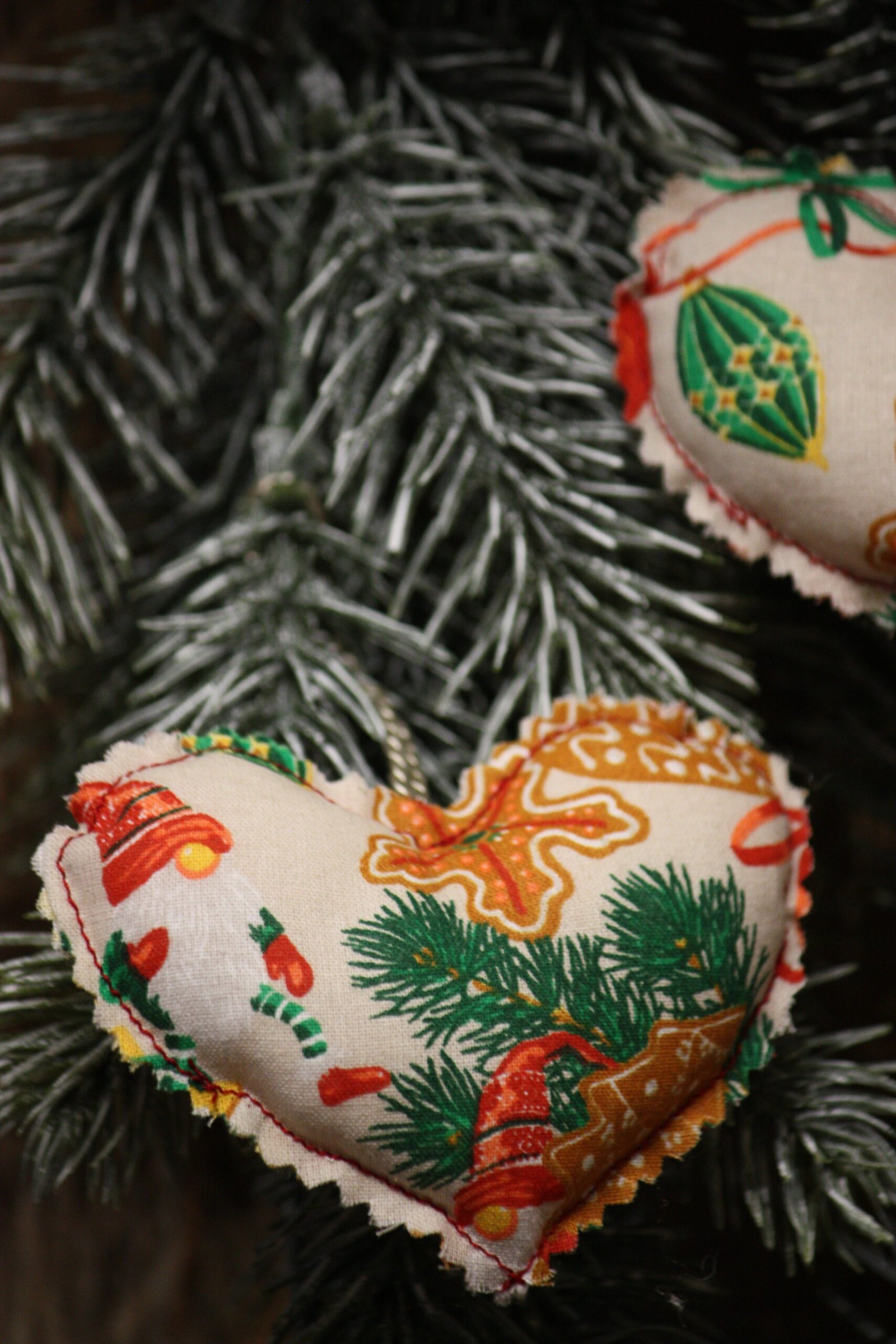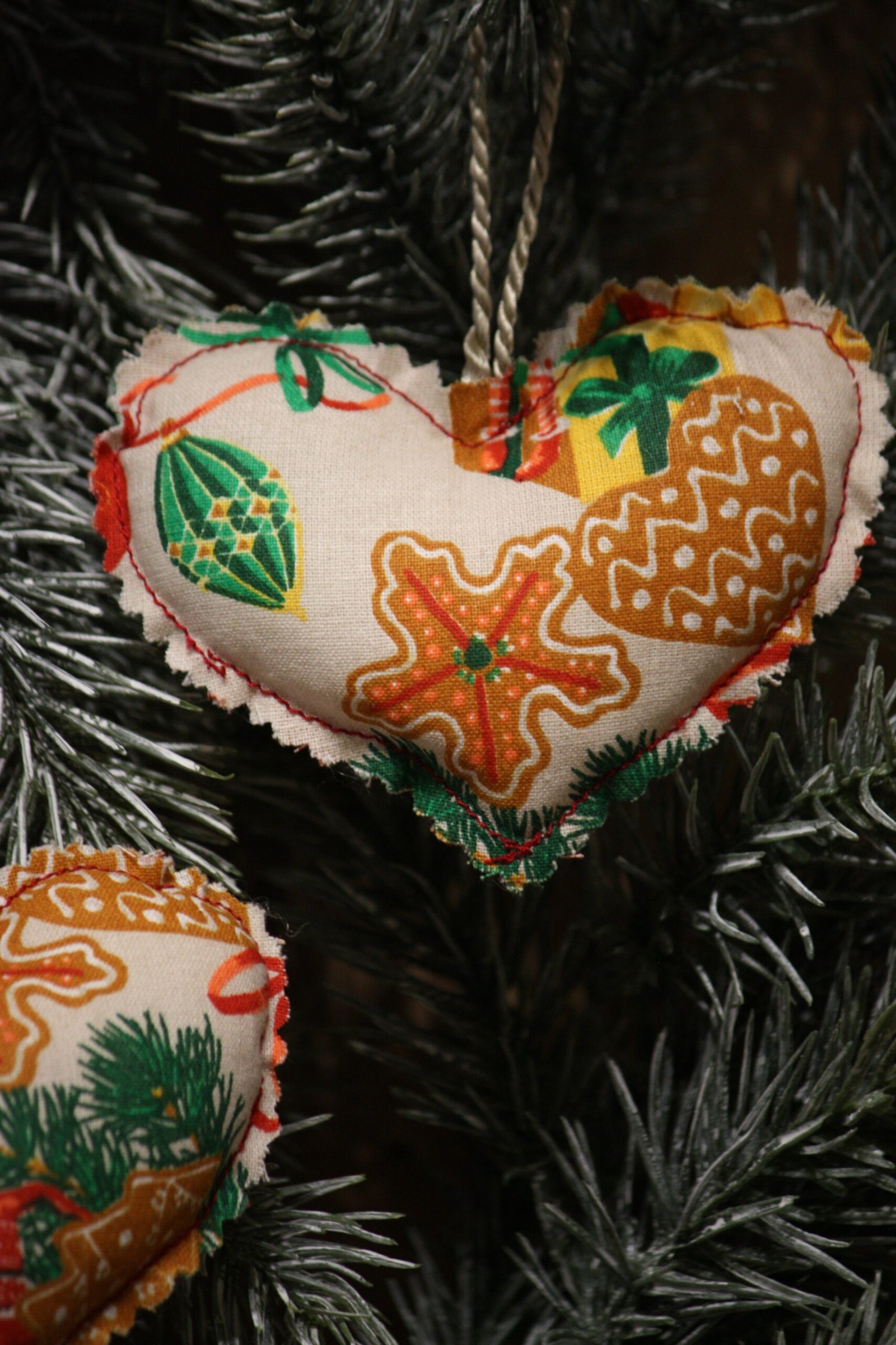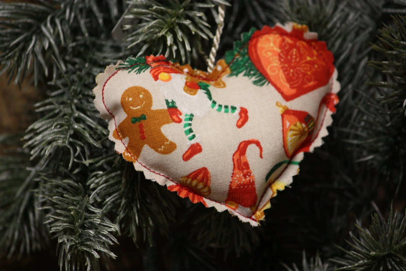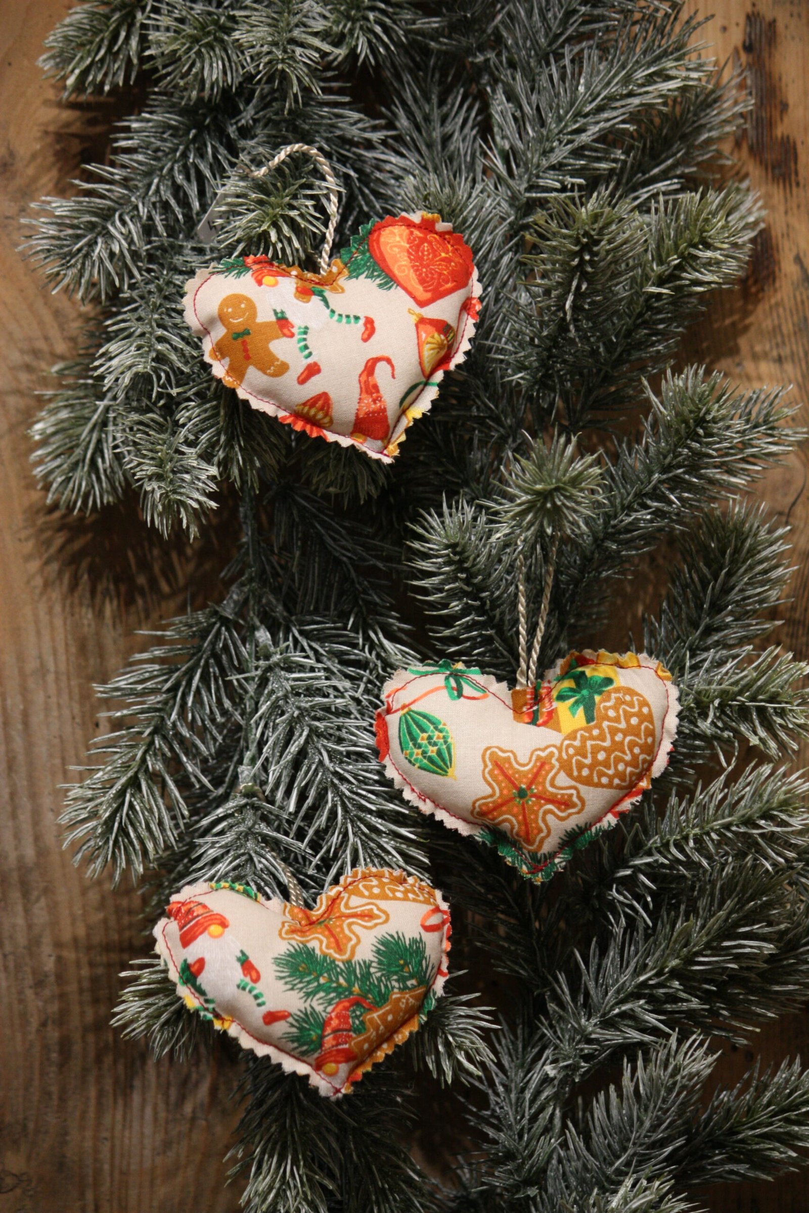 Petit coeur de Noël en tissu à suspendre au sapin ou ailleurs / Petit coeur en coton imprimé motif noël / Petite cordelette pour suspendre / Création artisanale, par Boiseline