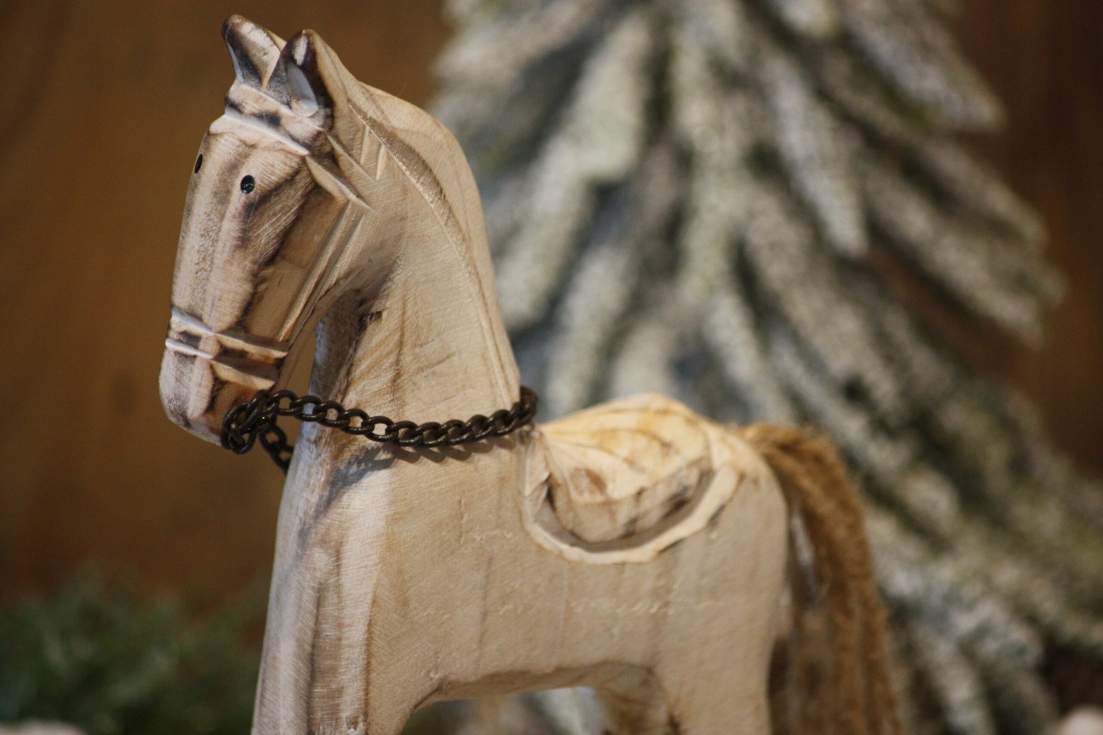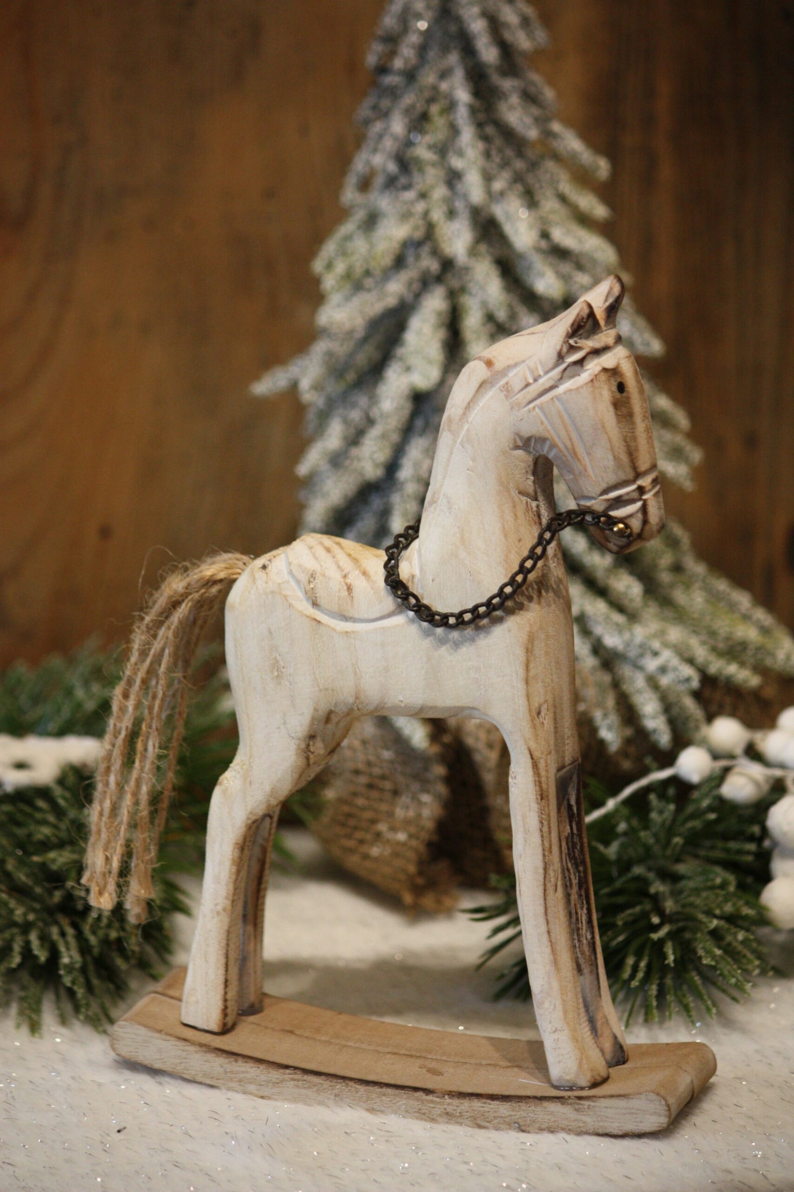 Ce cheval cérusé à bascule agrémentera vos diverses décorations ainsi que vos décorations de Noël ou d'hiver / Cheval à bascule en bois couleur cérusé / Petite chaînette en métal noir / Queue en ficelle