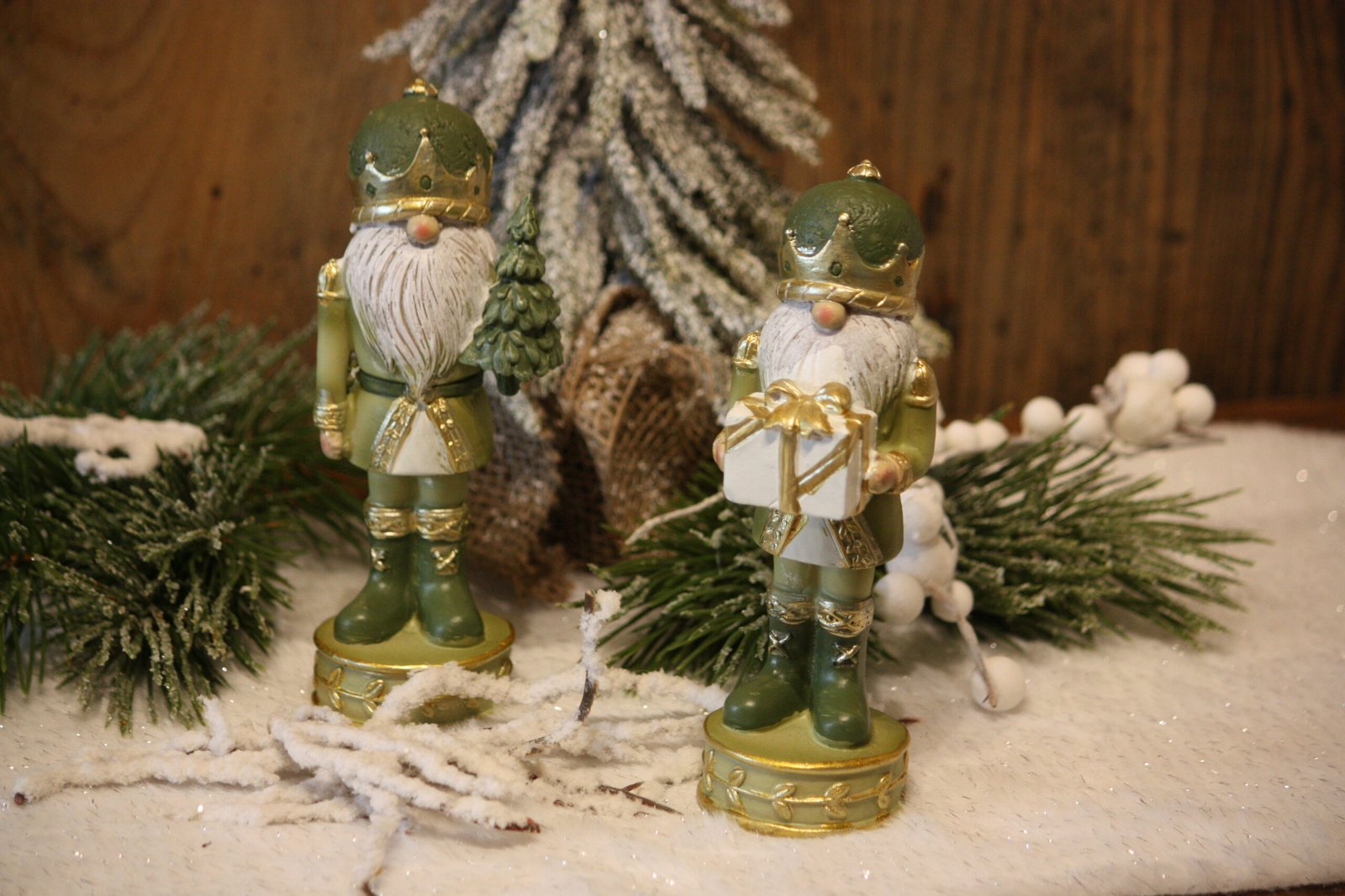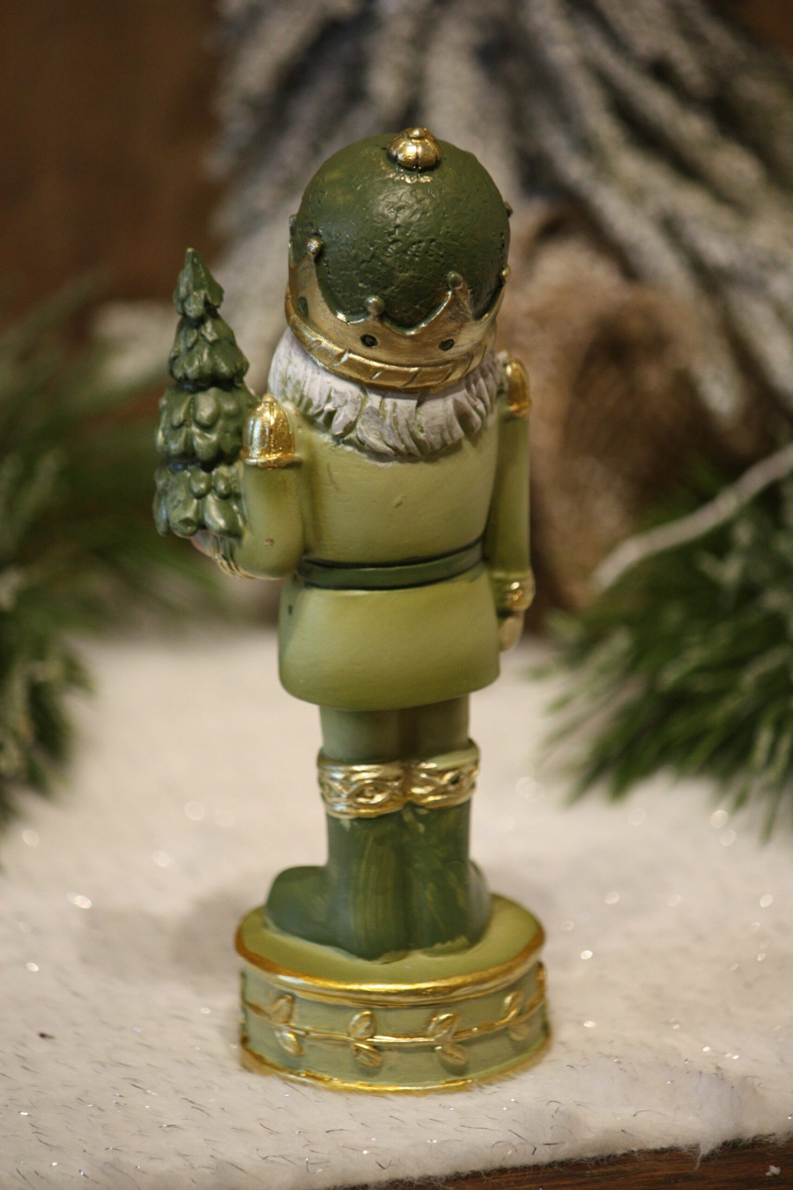 Accueillez ce soldat Casse-noisette vert, doré, blanc et son sapin dans votre décoration de Noël / Résine synthétique